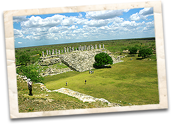 A un costado de la casa principal de la hacienda se encuentra la zona arqueológica, entre ésta el edificio de las columnas, llamado así por sus pilastras y que se levanta frente a una explanada, la cual ha sido estudiada y restaurada por el INAH recientemente. La construcción tiene una escalera casi monumental, arriba se conservan 33 pilastras de piedra en 3 hiladas, desde donde se obtiene una vista general del sitio.